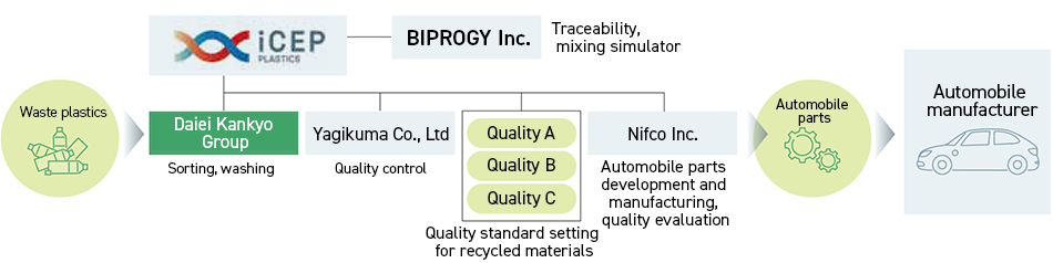 It has been one year since we launched iCEP PLASTICS, a comprehensive recycling coordination service offering one-stop support from the collection of waste plastics to the supply of recycled products through molding and processing. This service is a collaborative effort by Daiei Kankyo Co., Ltd., Resource Circulation Systems Co., Ltd., Yagikuma Co., Ltd., and UNIADEX, Ltd., working together to plan and implement a recycling scheme for waste plastics and promote a circular economy through “artery–vein” collaboration. Over the past year, we have accumulated numerous achievements, especially in the construction industry, and in March 2025, we launched the “XtoCar” project, which aims to recycle waste plastics into automotive parts.